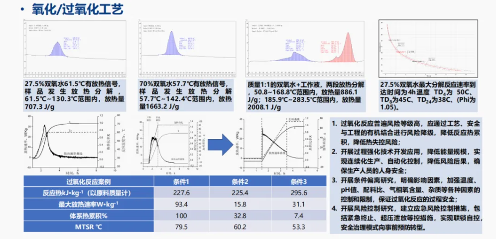 1. 过氧化物含有过氧基不稳定官能团,具有稳定性差,分解活化能低,具有受热、振动、冲击或摩擦等敏感特性。大多过氧化反应体系具有自分解特性,分解放热量大,分解速度快,有爆炸风险。例如:双氧水制备和涉及使用双氧水的过程。